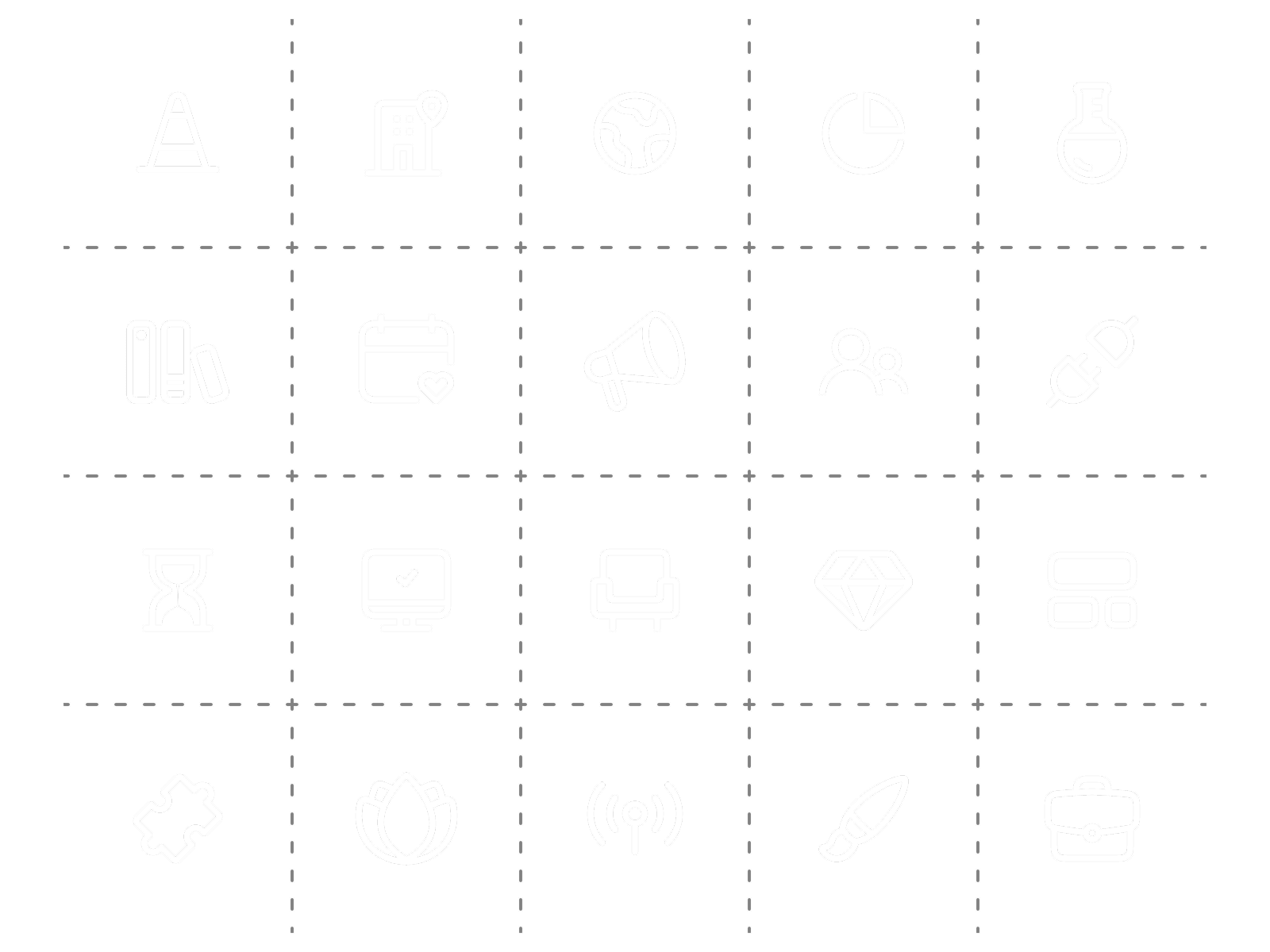 Notice windows in the building icon, realistic handle of the megaphone icon, lines in diamond icon, and flap of the briefcase icon.