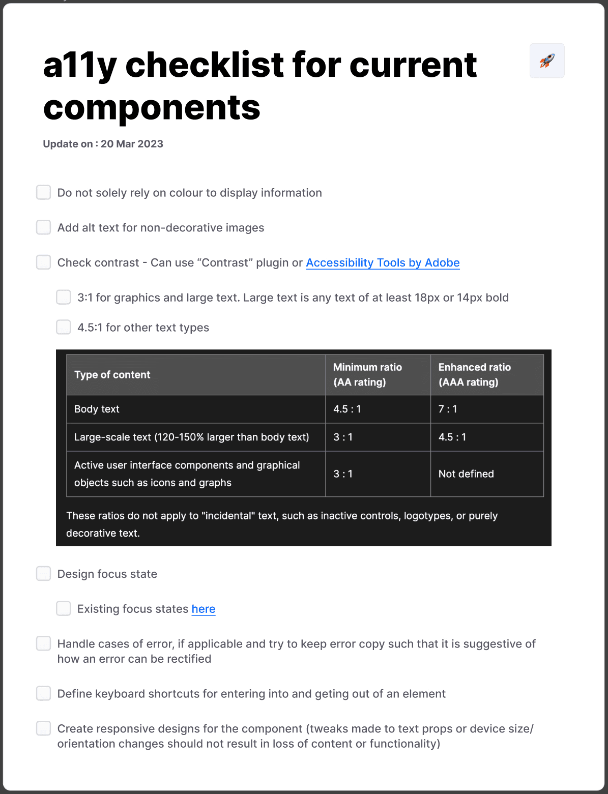 I researched and filtered out the guidelines for all four areas of accessibility to create a checklist for the team to follow. Using the checklist, the team made sure that all elements of the components met minimum contrast ratio, had focus states, had defined keyboard shortcuts, and included alternate text for non-decorative images.